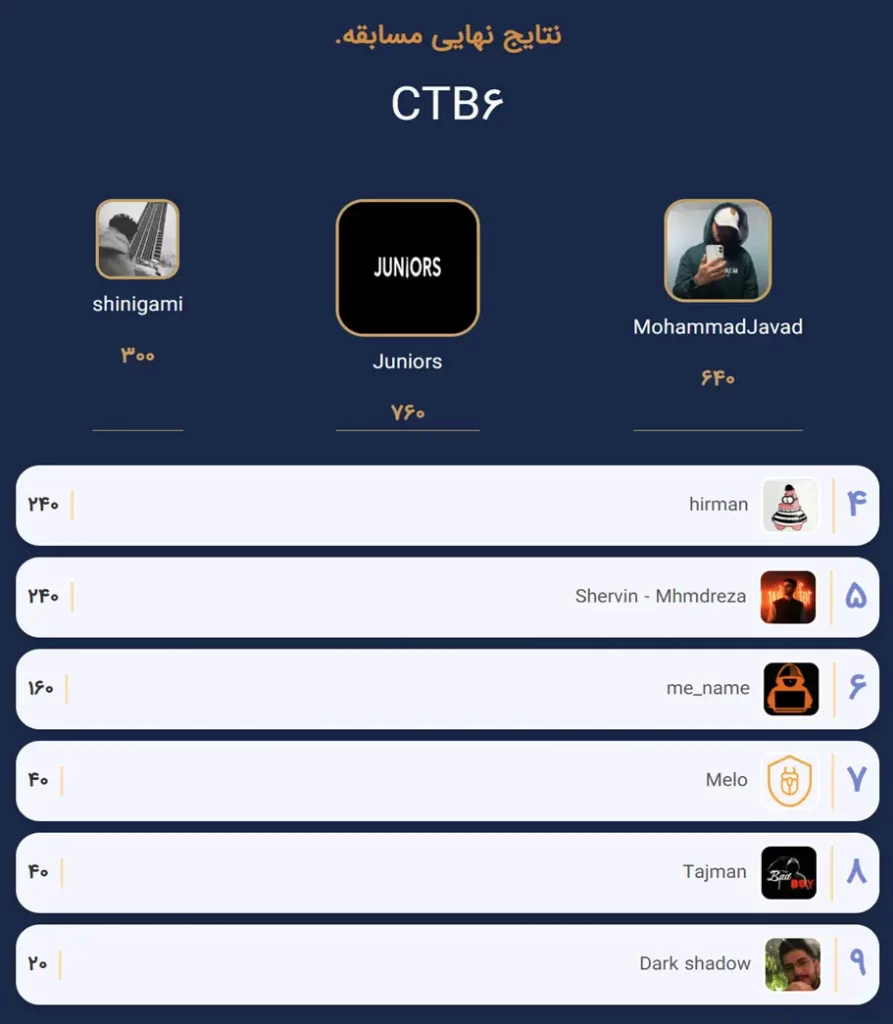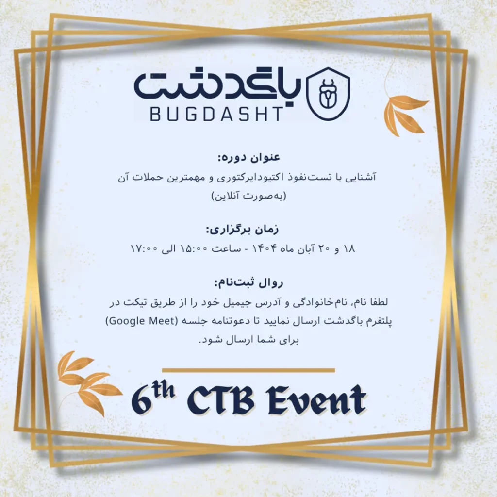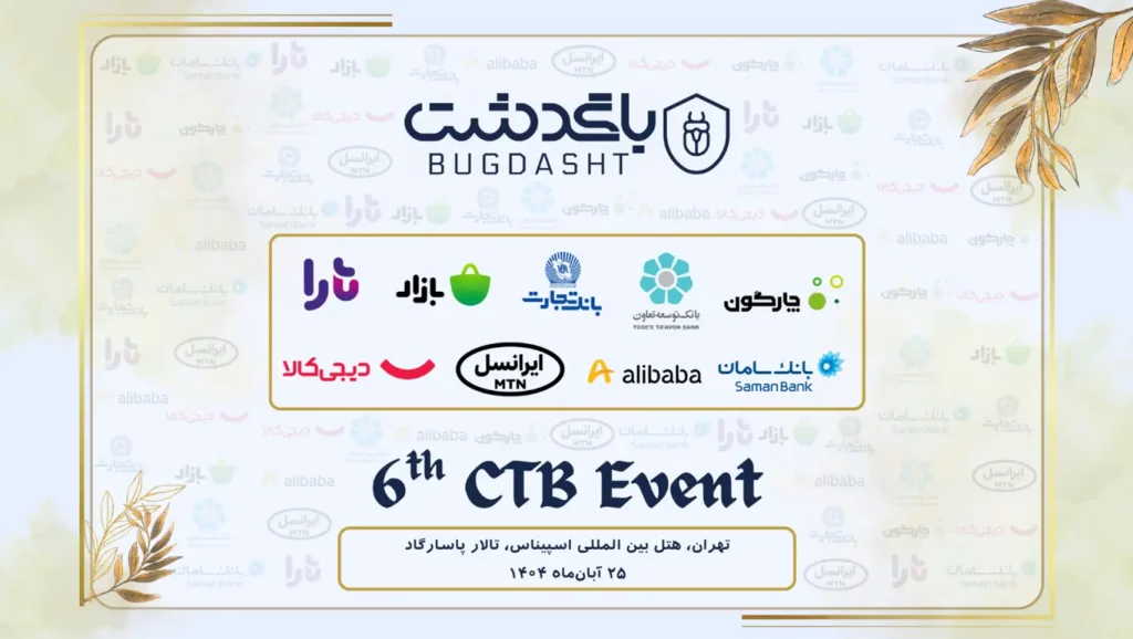 بیست و پنجم آبان ماه، اختتامیه ششمین رویداد امنیتی CTB باگدشت از ساعت ۱۴ الی ۱۸ در سالن پاسارگاد هتل اسپیناس با حضور مدیران ارشد و متخصصین امنیت کشور برگزار گردید.